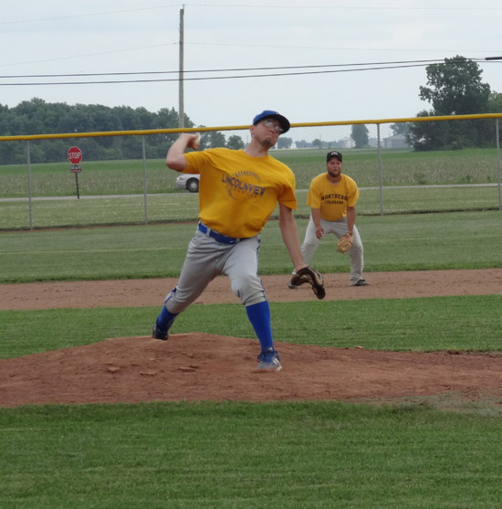 The annual Lincolnview Alumni Baseball game was played on Tuesday, with the Blue team defeating the Gold team 4-3. Pictured above is 2007 graduate Chris Boyd taking a strike. The catcher is 1991 graduate Chad Overholt. Firing a pitch in the below is 2003 graduate and current assistant baseball coach Eric Giessler. Other members of the Gold team were Nick Leeth (2013), Kyle Thatcher (2009), Josh Hoehn (2008), Ryan Kreisher (2001), Taylor Hessling (2009), Ethan Parsons (2018), Adam Owens (1998), Jalen Roberts (2016) and Jake Pollack (2025). Members of the Blue team included Dalton Schmersal (2015), Kory Thatcher (2007), Jason Adams (1987), Dalton Hines (2015), Kevin Price (2001), Chayten Overholt (2018), Connor McCleery (2014) and Dave Jessee (1994). Photos by Scott Truxell/Van Wert independent