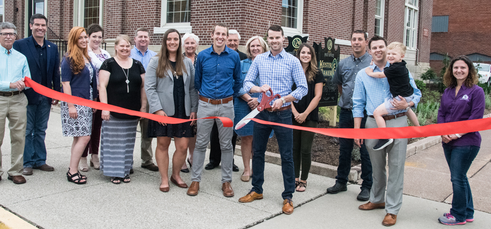 Aaron Baker cuts the ribbon on the renovation of the former post office/Van Wert Municipal Court building on South Walnut Street. Looking on are family, staff members, contractors, and various officials, including Ohio Representative Craig Riedel, Van Wert Mayor Jerry Mazur and Van Wert Area Economic Development Corporation Executive Director Stacy Adam.
