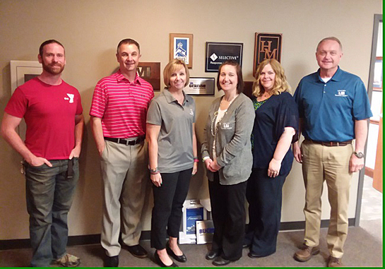 Leland Smith Insurance is sponsoring a Business Day at the YMCA’s Camp Clay Aqua Center on Thursday, July 5. Because of the sponsorship, those using the Aqua Center that day will pay only a $3 admission charge. Shown with Camp Clay Director Kevin Morrison are Jason Bohyer, Krista Schlemmer, April Korte, Lisa Horstman, and Randy Myers of Leland Smith Insurance. YMCA photo