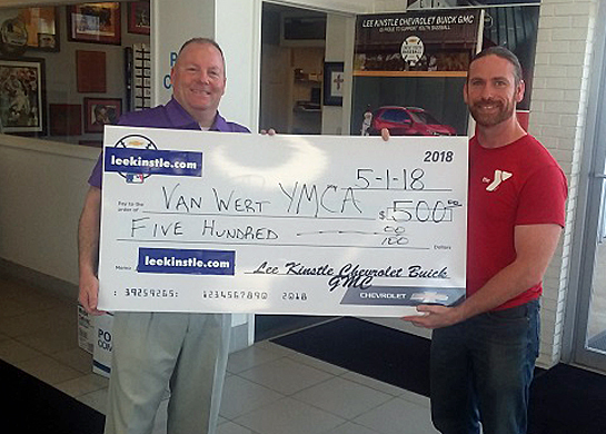 Lee Kinstle GM Sales & Service is sponsoring a Business Day at the YMCA’s Camp Clay Aqua Center on Monday, July 9. Because of the sponsorship, those using the Aqua Center that day will pay only a $3 admission charge. Shown with Camp Clay Director Kevin Morrison (right) is Eric McCracken of Lee Kinstle. YMCA photo