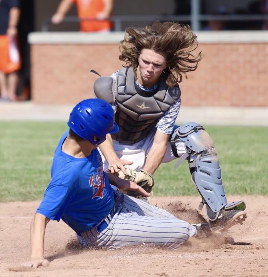 Crestview’s Brant Richardson is tagged out by Elida catcher Jordan Davis during Friday’s ACME district baseball game at Lima Central Catholic. The Bulldogs jumped out to a 6-0 lead after two innings and went on to defeat the Knights 8-2. Crestview’s runs came in the third inning, when Kaden Short scored on an error and Riley Saylor crossed home plate on a passed ball. The Knights will play again today against the loser of Van Wert/Shawnee. The Indians led that game 6-5 entering the top of the seventh inning last night, but play was stopped due to darkness. The game will resume at 10 a.m. this morning. Photo courtesy of Wyatt Richardson
