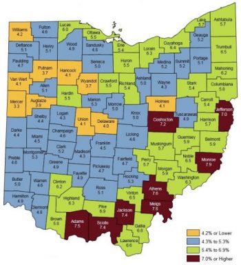 The counties with the highest unemployment rate in June were in southern or southeastern Ohio. Monroe County had the highest jobless rate (7.9 percent), followed by Meigs County (7.8 percent), Athens County (7.6 percent) Adams County (7.5 percent), Jackson and Scioto counties (7.4 percent) Coshocton County (7.2 percent) and Jefferson County (7.0 percent).