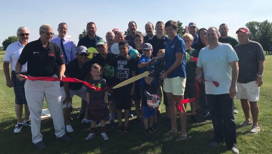 Darcy Crummey, Director of Golf Operations at Hickory Sticks Golf Club, cuts the ribbon Friday on the club’s new Foot Golf and Disc Golf Course in Van Wert. Each addition features nine holes, and is free for Hickory Sticks members, YMCA members or children who participated in a golf clinic this summer. All others will be charged $5, plus a deposit for the discs. Photo by Scott Truxell/Van Wert independent