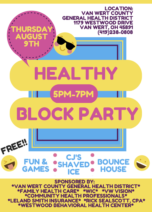 Plan to attend the Healthy Block Party on Westwood Drive from 5-7 p.m. Thursday, August 9. Family Health Care of Northwest Ohio, the Van Wert County General Health District, and Westwood Behavioral Health have teamed up to host this event.