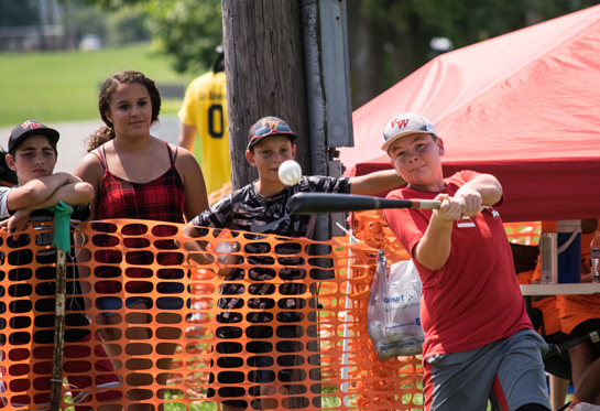 The Wiffleball flies off the bat of Kaden Farmer of the Welker team during Saturday’s Van Wert Rib Fest Wiffleball Tournament at the Van Wert County Fairgrounds. A Corn Hole tournament was also held during the annual festival. Dave Mosier/Van Wert independent