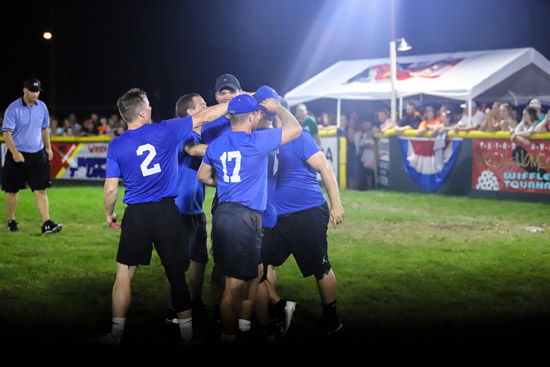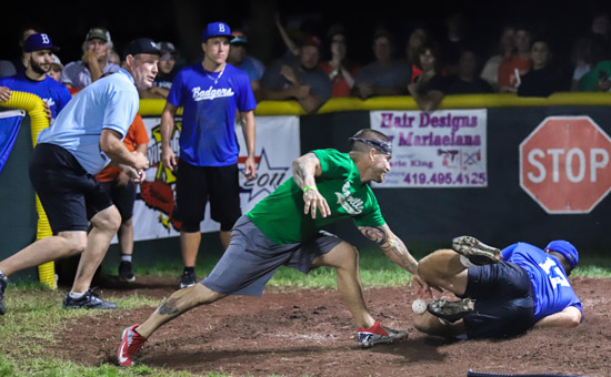 Justice Tussing slides into home and scores what proved to be the winning run in the 27th annual Wrenway Park Wiffleball Warehouse Tournament championship game on Saturday night. The Van Wert First Federal Honey Badgers defeated the Longballers 6-5 in nine innings to capture the 2018 title. Below, Tussing and several of his teammates celebrate. Photos by Wyatt Richardon/Van Wert independent