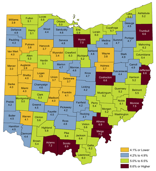 Nine counties had unemployment rates at or above 6.5 percent in July, led by Monroe County at 7.5 percent. The other counties are as follows: Adams County, 7.2 percent; Huron and Meigs counties, 7.0 percent; Athens and Scioto counties, 6.9 percent; and Coshocton, Jefferson, and Trumbull counties, 6.6 percent.