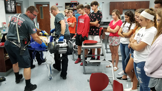 Van Wert Fire & EMS personnel demonstrated how they respond to an emergency by providing a live simulation for the class. As part of the scenario for the day, Rollins was first on the scene to find “Mrs. Garcia”, the medical mannequin used in the simulation, unresponsive and called 9-1-1. He ushered the first responders onto the scene and they provided a first-hand look at how they respond to this type of scenario by attempting to provide Mrs. Garcia with an IV, starting CPR, and even using a defibrillator.