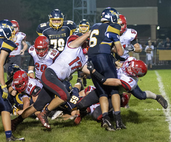 Joey Schaufelberger (20), Parker Conrad (17), Owen Treece (7) and the rest of Van Wert’s defense will need to contain Shawnee quarterback Johnny Caprella. Bob Barnes photo