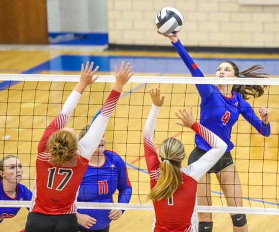 Crestview’s Avery McCoy makes a play at the net during Thursday night’s Northwest Conference match against Delphos Jefferson. McCoy finished with 14 assists and six kills, and the Lady Knights enjoyed 25-20, 25-9, 25-19 victory. Bailey Gregory had 23 digs and Lexi Gregory had 12 kills. Crestview (8-3, 3-1 NWC) will host Van Wert on Monday. Photo by Wyatt Richardson/Van Wert independent