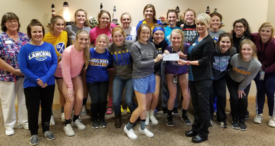 The Lincolnview Lady Lancers volleyball team hosted a Volley for the Cure event on September 29, to benefit Van Wert Area Inpatient Hospice Center. Team members and coaches recently presented an $800 check from Lincolnview Athletic Boosters to hospice nurses Kimberly Myers (front) and Lisa Heath. Volley for the Cure was started by two friends in 2006 to bring awareness to breast cancer and a fundraising event. Van Wert Area Inpatient Hospice Center is operated by Community Health Professionals (CHP) and is designed to meet the needs of patients and their families when a loved one has a terminal diagnosis from cancer or any other advanced disease by managing pain and symptoms, offering respite and palliative (comfort) care, and hospice services. Photo submitted