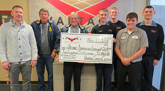 Vantage Career Center Student Ambassadors held their annual Veterans Day fundraiser and sold small flags to be placed in a flag field displayed on the Vantage front lawn to honor veterans. Through those sales, 539 flags were sold, raising $269.50 to donate to American Legion Post 297 in Payne. Presenting the check to Post Commander Tim Baumle and Financial Officer Norm Meyers are Student Ambassador Advisor Ray Gibson and senior student representatives Ethan Geise/Industrial Mechanics (Ottoville), Corbin Contreras/Construction Equipment Technology (Van Wert), Brock Schooley/Construction Equipment Technology (Paulding), and Austin Weyraugh/Precision Machining (Fort Jennings). Vantage photo
