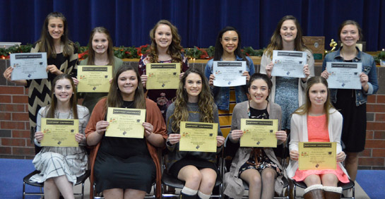 The Crestview football cheer program recently recognized the squad’s accomplishments during the 2018 season. Cheer Scholar Athlete awards were presented to (row 1, left to right): Maisee Short, Dreama Hampton (also won MVP award), Chelsea Taylor, Josce Gallimore, and Emily Barricklow. Row 2: Jamie Balliet, Alyssa Hoersten, Haley Sheets, Lexi Harter, Nevaeh Pruett, and Alex Stefanek. Not pictured: Rosie Bogle, Alyssa Sparks, Jacqueline LeMieux and Amber Young. Crestview photo