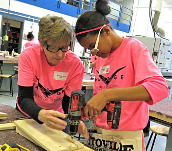 Shown is a participant and volunteer from a previous “Step Into Your Future” event using power tools to build a step stool in the Carpentry program. Vantage photo