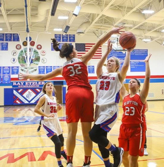 Olivia Cunningham (23) tries to shoot between two Bluffton defenders during Thursday night’s home opener for Crestview. The Lady Knights led 21-20 at halftime but were outscored 15-2 in the third quarter, on the way to a 51-35 loss to the Lady Pirates. Crestview (2-3, 0-2 NWC) will play at Fort Jennings on Monday. Photo by Wyatt Richardson/Van Wert independent