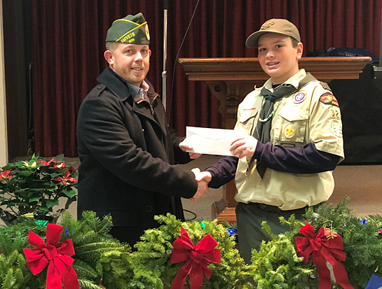 Amvets Post 698 in Middle Point provided a monetary donation to the Boy Scouts Troop 32 for the purchase of wreaths for the presentation of Wreaths Across America. Shown in the photo is Evan Elling of Troop 32 receiving the donation from Amvets Post 698 Commander Logan Welker. photo provided
