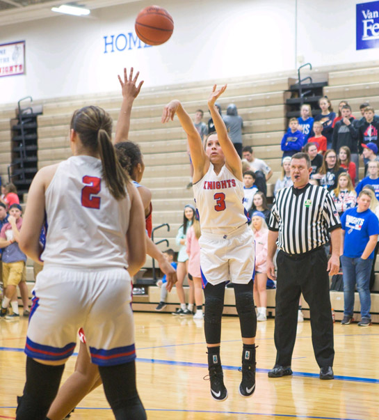 Bailey Gregory puts up two of her game high 16 points during Friday night’s 49-34 victory over Lima Central Catholic. The Lady Knights led 17-5 after the first quarter and 26-16 at halftime. Lexi Gregory and Olivia Cunningham each finished with 10 points as Crestview improved to 10-5 on the season. The Lady Knights will host Antwerp on Tuesday. Wyatt Richardson/Van Wert independent