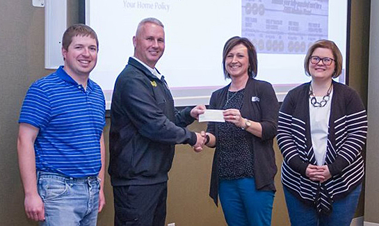 Buckeye Insurance Professionals, a chapter of the International Association of Insurance Professionals (IAIP), presented a $500 check to the “No Child Sleeps Unprotected” county smoke detector program. Started in 2015 by Van Wert County fire chiefs, the program provides a smoke detector with a 10-year battery to all incoming kindergarteners and K-9 students who have moved into the county in the past year. The annual cost of the program is approximately $5,000. Those interested in donating to the Smoke Detector Fund can contact the Van Wert Fire Department or the Van Wert County Foundation. Presenting the donation to Van Wert Fire Chief Jon Jones are Buckeye Insurance Community Service Committee co-chairs Jonathan Haggis and Shonda Vorst and Buckeye Insurance President Rebecca White. photo provided