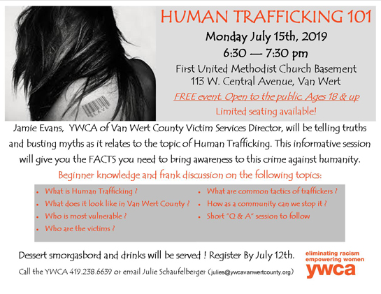 The YWCA of Van Wert County will be hosting a Human Trafficking 101 event free to the public on Monday, July 15.