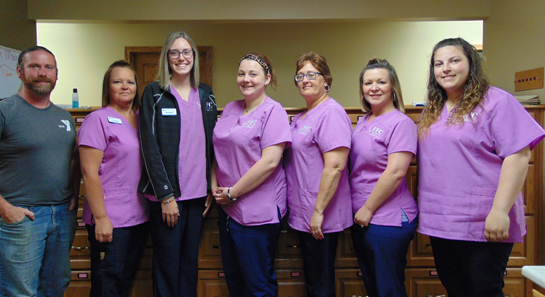YMCA Camp Clay Director Kevin Morrison thanked Foster Family Chiropractic in Van Wertfor its generous sponsorship of the Aqua Park and splash pad on July 2. Area residents can enjoy $3 admission Monday-Thursday all summer, thanks to the YMCA’s business sponsors. Shown with Morrison are Foster Family Chiropractic staff members Angie, Morgan, Payton, Mel, Kendra, and Kirstin. YMCA photo
