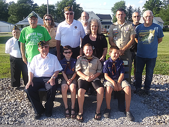 Approximately two years ago, the Ohio City Warrior Trail Committee started a project that would provide the trail with benches paid for by collecting bottle caps. Since this was a youth program, the committee contacted Ben Reigle and the Cub Scouts of Rockford Pack 98 to assist. The Cub Scouts collected enough caps for five benches (each bench took 1,250 caps and entailed some related expenses). Ohio City American Legion Post 346 covered the other expenses, while the Ohio City Warrior Trail Committee paid for the labor, transportation, placement, and donor plates. Shown are (front row, from the left) Harvey McMillen, Levon Fox, Wyatt Pancake, Peyton Muhlenkamp; (middle row) Jaime Delgado, Gary Profit, Brenda Weaver, Ben Reigle, Frank Krugh; (back row) Steve Anderson, Greg Bruns, Don Walker, and Dan Amweg. photo provided
