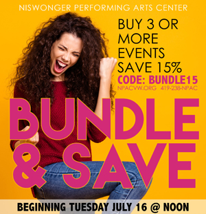 The Niswonger Performing Arts Center, along with Season Sponsors Central Insurance, Chuck and Karen Koch, and Statewide Ford Lincoln, announce the availability to “Bundle & Save” on ticket purchases for the 2019-20 season.