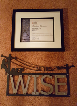 The plaque and artwork shown were given to Mike Wise when he celebrated his 50th anniversary with AEP on June 16.