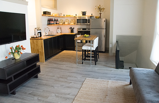 Upstairs are two luxury loft apartments, one unfurnished apartment available for long-term lease that Rammel said was just leased and a second, furnished apartment available for short-term leasing: from three days to six months, or possibly longer.
