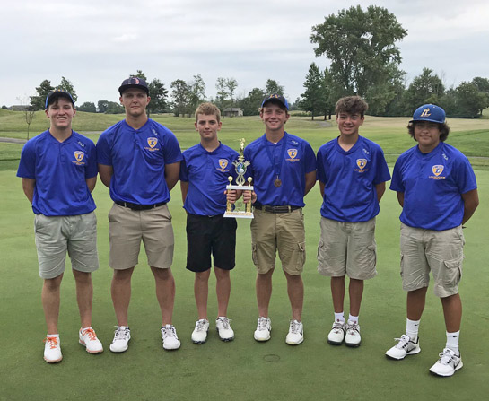 Lincolnview finished third out of seven teams at the Lincolnview Golf Invitational held Monday at Hickory Sticks Golf Course. St. Henry captured first with 329 team points, followed by Allen East (351), the Lancers (373), Parkway (375), Crestview (431) and Lima Sr. (482). Pictured above are Lincolnview’s Avery Slusher (97), Cole Binkley (93), Dane Ebel, Landon Price (88), Grant Glossett (95) and Evan Miller. Brett Hammons photo
