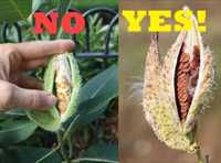 Seed pods from common milkweed should be collected only when the pods are dry and brown-gray in color. If the center seam pops with gentle pressure, they can be picked. The seeds in green pods will not be viable and won’t be able to be used. Be patient and don’t collect too soon!