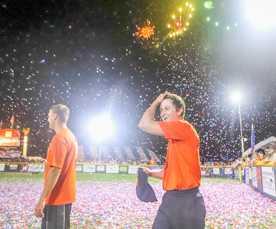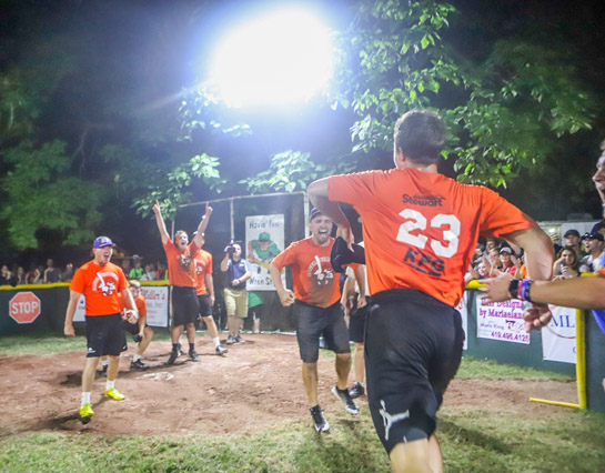In dramatic fashion, Spencer Rolsten (23) hit a three-run homer in the 10th inning that gave the Eager Beavers an 11-8 victory over the Honey Badgers, and the celebration ensued after Saturday night’s 28th annual Wiffleball Warehouse Tournament championship game at Wrenway Park. Photos by Wyatt Richardson/Van Wert independent