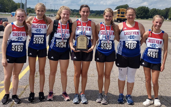 Crestview’s girls’ cross country team took third place at the OHSAA Early Season Invitational at National Trail Raceway in Hebron on Saturday. Pictured from left to right: Megan Mosier, Baylee Miller, Lauren Walls (29th place), Ragen Harting (eighth), Emily Greulach (23rd), Kiera Anderson, and Kate Leeth. Walls, Harting and Greulach each received medals. The Knights will travel to the Bob Schul Invitational next Saturday which is held at Milton Union High School. Randy Grandstaff photo