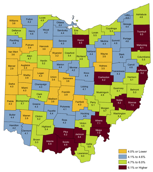 In addition, seven counties saw jobless rates at or above 6.5 percent. The county with the highest unemployment rate was Monroe County, at 7.5 percent, followed by Athens County, 7.1 percent; Meigs County, 7.0 percent; Adams County, 6.8 percent; Scioto County, 6.6 percent; and Huron and Trumball counties, 6.5 percent.