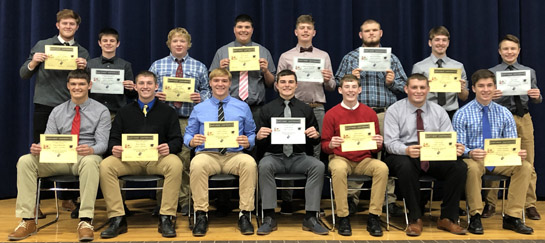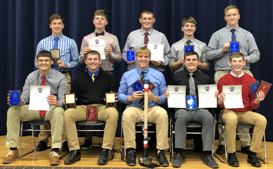 The Crestview Football program recently concluded its season with head coach Jared Owens, along with his coaching staff and the football cheer program, recognizing the team’s accomplishments throughout the season. Football Scholar Athletes include: Row 1(above, left to right): Carson Kreischer, Brody Brecht, Isaiah LaTurner, Caylib Pruett, Kaden Short, Colby Swager, Logan Gerardot. Row 2: Tyler Hart, Hunter Rothgeb, Ian Bailey, Trever Sheets, Ayden Lichtensteiger, Dylan Barricklow, Dalton Castle, Nick Helt. Football Special Awards: Row 1 (below, left to right) : Carson Kreischer (Pride Award, NWC 2nd Team), Brody Brecht (Defensive Award, Captains Award, NWC 1st Team), Isaiah LaTurner (Defensive Award, Pride Award, Sledgehammer Award, Captains Award, NWC 1st Team), Caylib Pruett (Pride Award, NWC Honorable Mention), Kaden Short (Pride Award, Captains Award, NWC Honorable Mention). Row 2: Logan Gerardot (Defensive Award, NWC 1st Team), Ayden Lichtensteiger (NWC Honorable Mention), Colby Swager (Pride Award, NWC Honorable Mention), Dalton Castle (Pride Award), Noah Riggenbach (Pride Award). Crestview photos