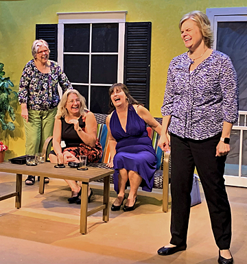 The Savannah Sipping Society cast members (from the left) Terry Plas as Dot, Nicolle Merkel as Randa, and Jan Miller as Jinx laugh as Amy McConn as Marlafaye recounts her unexpected dating experience.