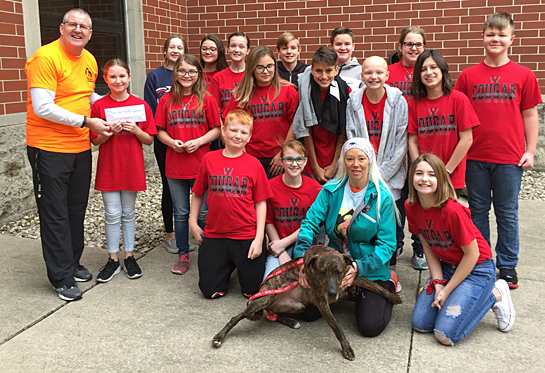 Under the leadership of Van Wert Middle School teacher Marie Markward and community volunteer Rachel Hoverman, the sixth grade Cougar Leaders raised $250 for the Humane Society Capital Campaign. The civic-minded students sold “canes for canines” during the Christmas season. Shown above is Humane Society Vice President Franki Eggleston with lovable Reed, as well as Humane Society board member Jeff Hood, receiving a generous donation. The Humane Society is raising money for a new shelter on Fox Road and will be kicking off the campaign in a big way in March 2020.  photo provided