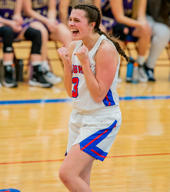 Crestview’s Bailey Gregory celebrates after draining one of her school record eight three pointers during Thursday’s 75-39 win over Ada. Five of those treys came in the second quarter (see game recap above). Photo by Wyatt Richardson/Van Wert independent