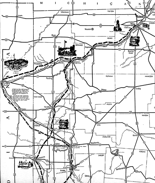The march upstream again passed through Paulding County, on the north side of the Maumee River. During the three-day trek from Fort Defiance to the headwaters, the army camped here once, near Antwerp. Local legend tells us a detachment traveled up Flat Rock Creek and camped for a few days about a mile southwest of Paulding, near what is known know as “Lovers Lane” (Road 132) southeast of the county hospital.