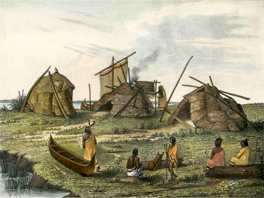 Depiction of an Ottawa village that shows their elm bark wigwams, which are probably similar to their dwellings at Oquanoxa’s reservation (Charloe) along the Auglaize River before the Ottawa were removed to Kansas in 1832.