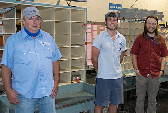 Van Wert postal workers (from the left) Dale Burden, Alex Cunningham, and Chris Mills pose in the local post office’s mailroom. Dave Mosier/Van Wert independent