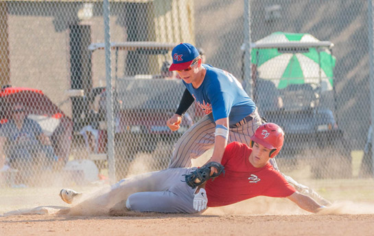 Crestview’s Ayden Lichtensteiger applies the tag to a Delphos Jefferson baserunner during Monday night’s game between the two teams. The Knights improved to 4-6 by cruising to a convincing 10-1 win over the Wildcats. Crestview is scheduled to finish the season Friday at home against Van Wert. Photo by Wyatt Richardson/Van Wert independent