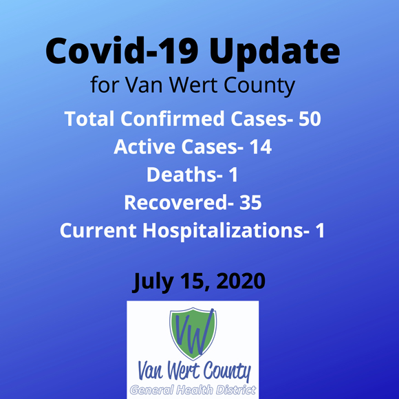 The Van Wert County General Health District has reported 50 confirmed cases of Covid-19. Of those cases, 14 are active, one person is hospitalized, 35 people have recovered, and there has been one death. Of the latest two cases, the 49th case is between the ages of 70 and 79 and the 50th case is between the ages of 20 and 29.