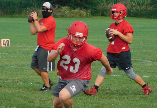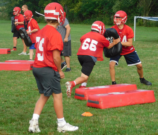 Despite uncertainty about the upcoming high school football season, the Van Wert Cougars hit the practice field Monday morning. Above, Damon McCracken runs a route and prepares to catch a pass from Owen Treece. Below, Cougar offensive and defensive linemen go through blocking drills. Scott Truxell/Van Wert independent