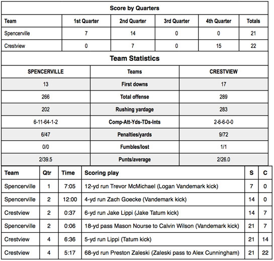 The Bearcats made it 14-0 when Zach Goecke took it in from the Crestview 4-yard line on the first play of the second quarter. Vandemark again kicked the PAT to give Spencerville a two-touchdown advantage.