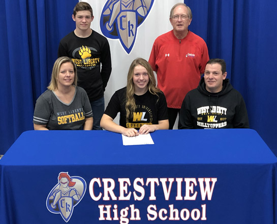Crestview High School senior Breena Grace recently signed on to play softball and pursue a degree in dental hygiene at Division II West Liberty University in West Virginia. “West Liberty is such a great school and I’m very excited to continue my education there,” Grace said. “I’ve been striving to play college softball ever since I was 14 years old, so I’m very happy that I accomplished my goal of committing,” She was joined by parents Nanette and Jeff, brother Levi Grace and coach Carl Etzler. Crestview photo