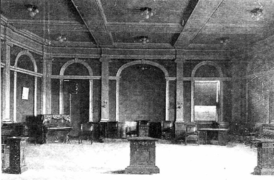 The third floor featured the 2,574-square-foot Home Guards lodge room, which also included a 2,106-square-foot gallery. The room was illuminated by 115 lights.