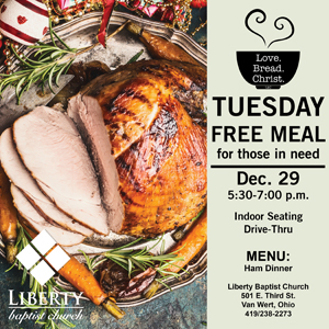 The next meal will be served Tuesday, December 29, beginning at 5:30 p.m., at Liberty Baptist Church, 501 E. Third St., in Van Wert. Drive-thru pick-up and indoor seating will be available.
