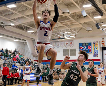 Kalen Etzler emphatically slams home two points for Crestview during Saturday’s game against Tinora. Wyatt Richardson/Van Wert independent