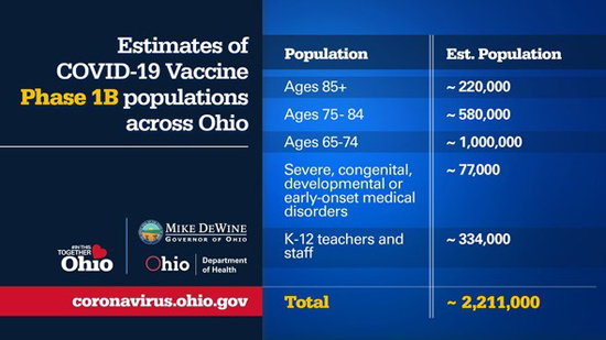 Phase 1B focuses largely on those who are 65 and older. Those in this age group are most vulnerable to COVID-19 and make up more than 87 percent of Ohioans who have died from the virus. Phase 1B also includes teachers and other school staff who will be offered the vaccine in an effort to get Ohio’s children back to school as soon as possible. In total, Phase 1B includes an estimated 2.2 million people.