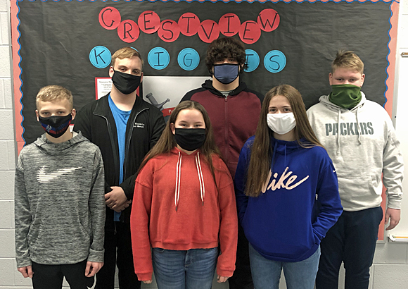 Crestview Middle School recently announced its Spelling Bee champions and runners-up. Spelling Bee winners for 2021 include (front row, from the left) Jacob Schumm (seventh grade runner-up), Braelyn Marsee (sixth grade champion), Dakota Thornell (seventh grade champion); (back row) Sam Boroff (eighth grade and CMS overall champion), Evan Pulfer (eighth grade runner-up), and Denver McDougall (sixth grade runner-up). Crestview photo